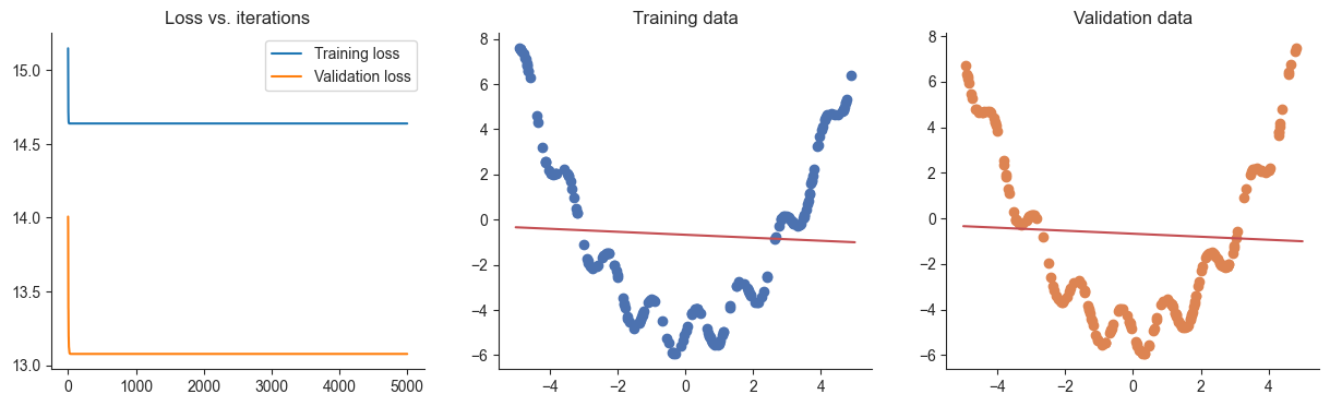 plotRegression(x, y, xvalid, yvalid, loss_history=losses, valid_loss_history=valid_losses, model=model)100%|██████████| 5000/5000 [00:01<00:00, 3079.02it/s]