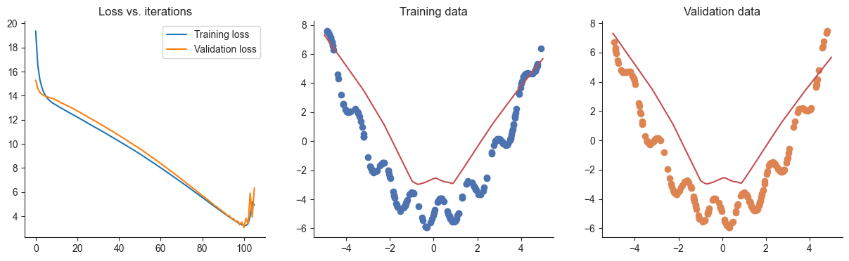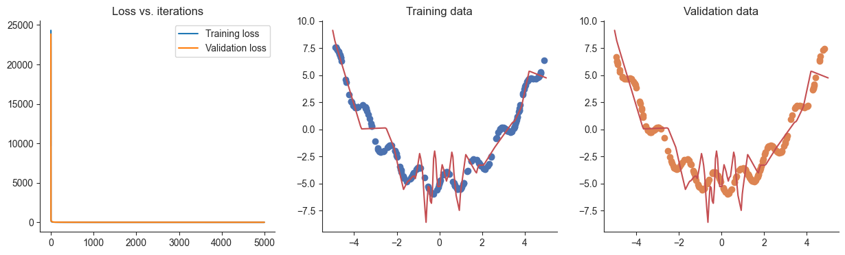 plotRegression(x, y, xvalid, yvalid, loss_history=losses, valid_loss_history=valid_losses, model=model) 1%| | 26/5000 [00:00<00:02, 2084.48it/s]