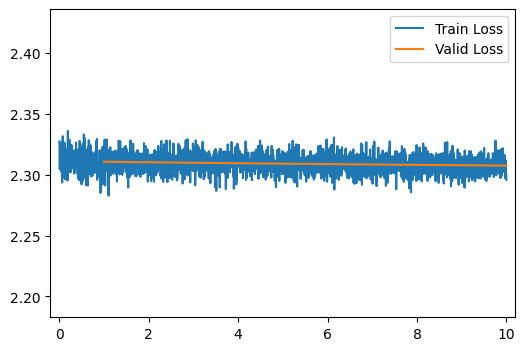 [ 6/10] Train Loss = 2.3089; Valid Loss = 2.3087; Valid Accuracy = 10.0%