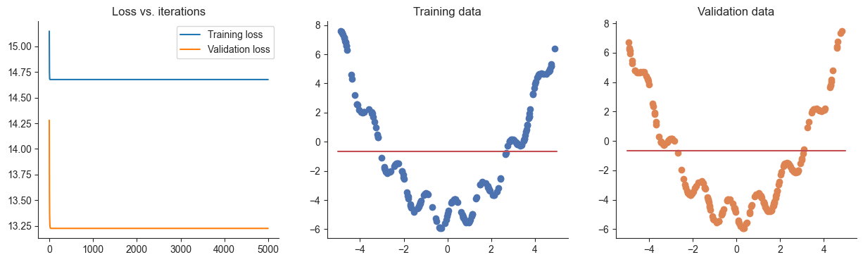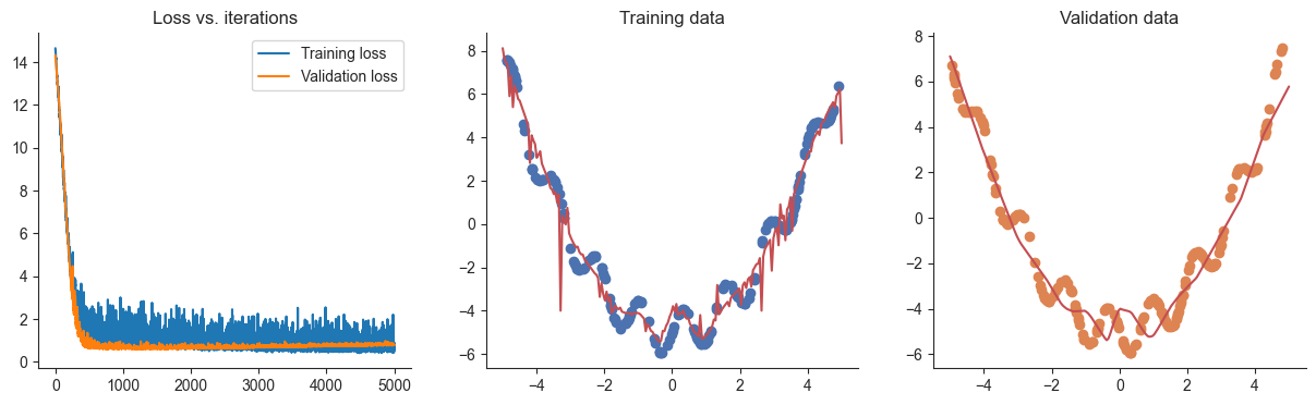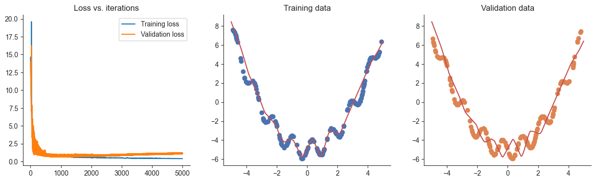 plotRegression(x, y, xvalid, yvalid, loss_history=losses, valid_loss_history=valid_losses, model=model)100%|██████████| 5000/5000 [00:01<00:00, 3079.02it/s]