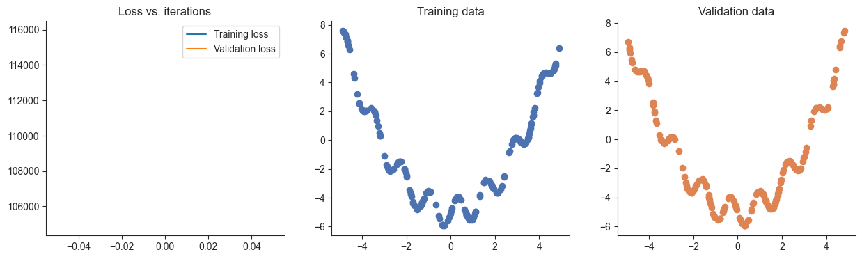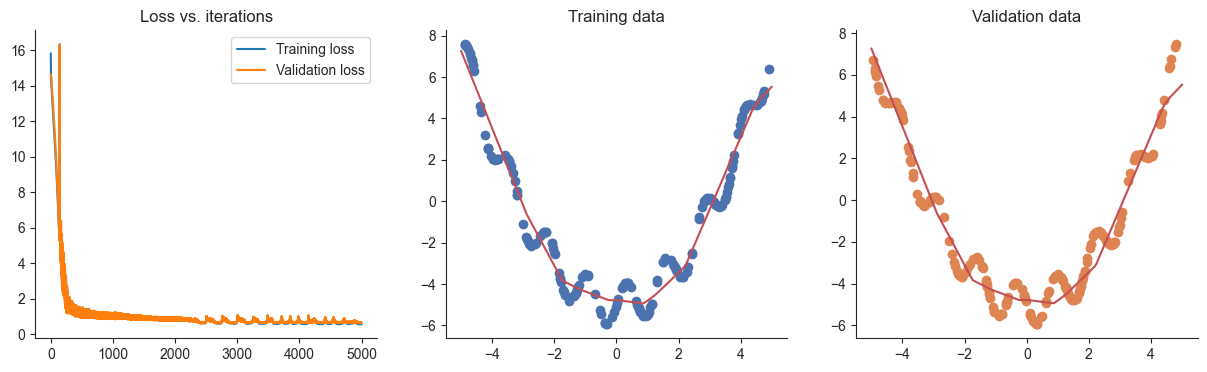 plotRegression(x, y, xvalid, yvalid, loss_history=losses, valid_loss_history=valid_losses, model=model) 1%| | 26/5000 [00:00<00:02, 2084.48it/s]