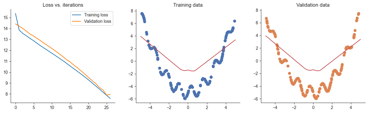 plotRegression(x, y, xvalid, yvalid, loss_history=losses, valid_loss_history=valid_losses, model=model)Passed!