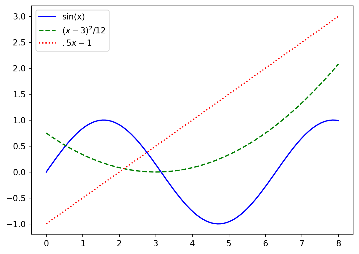 When plotting multiple point sets or curves we’ll likely want to be able to distinguish what each plot represents. We can do this by specifying a label for each plot, then adding a legend that tells us what each represents.