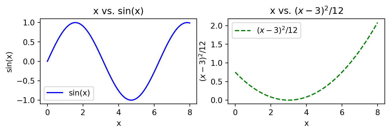 ax[1].plot(x_values, y2, 'g--', label='$(x-3)^2 / 12$'); # y2 in the 2nd
