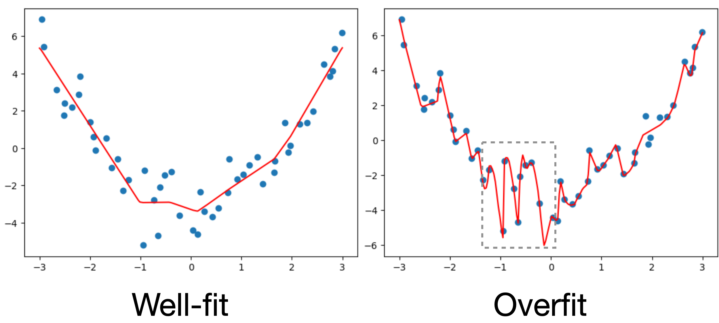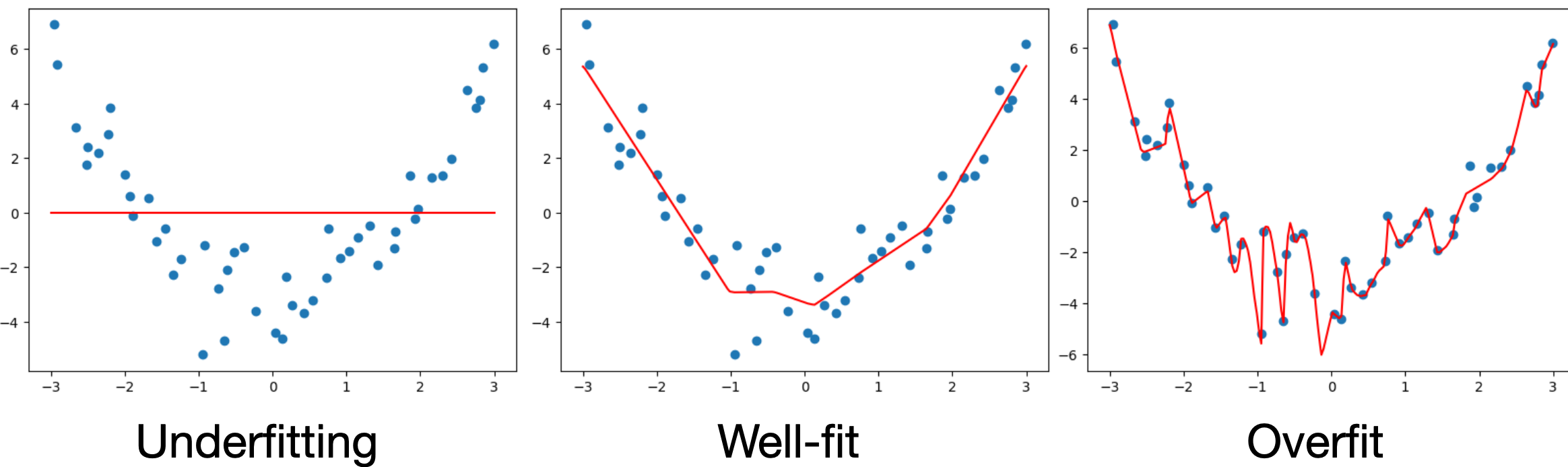 Here in the overfit case, our prediction function is trying to capture the noise of the data rather than just the overall trend. This is explicitly encouraged by losses like the mean squared-error loss, as the loss says fit every observation as closely as possible: