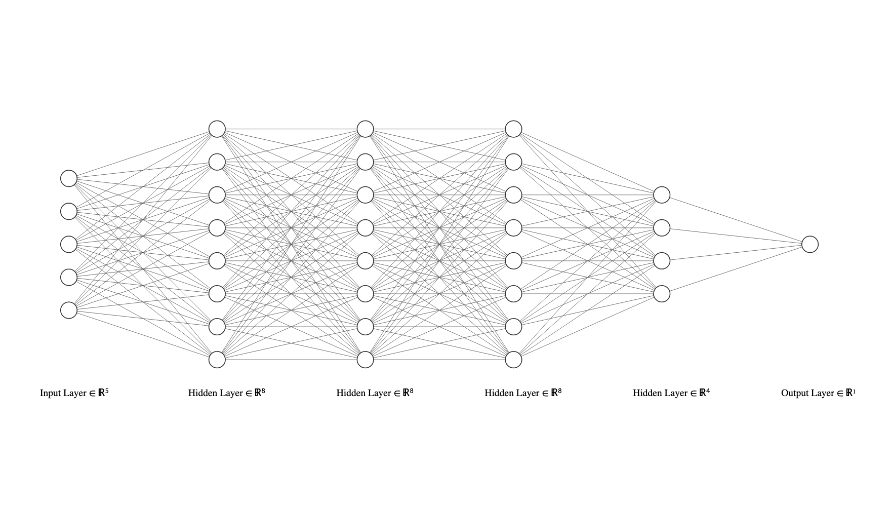 \[f(\mathbf{x}, \mathbf{w}_0,...) = \sigma( \sigma( \sigma( \sigma( \mathbf{x^T} \mathbf{W}_4 + \mathbf{b}_4)^T \mathbf{W}_3 + \mathbf{b}_3)^T \mathbf{W}_2 + \mathbf{b}_2)^T \mathbf{W}_1 + \mathbf{b}_1)^T \mathbf{w}_0 + \mathbf{b}_0\]
