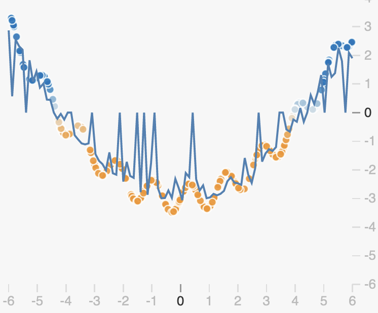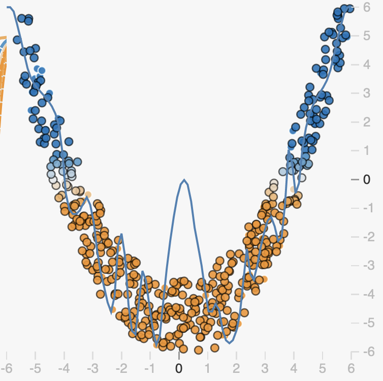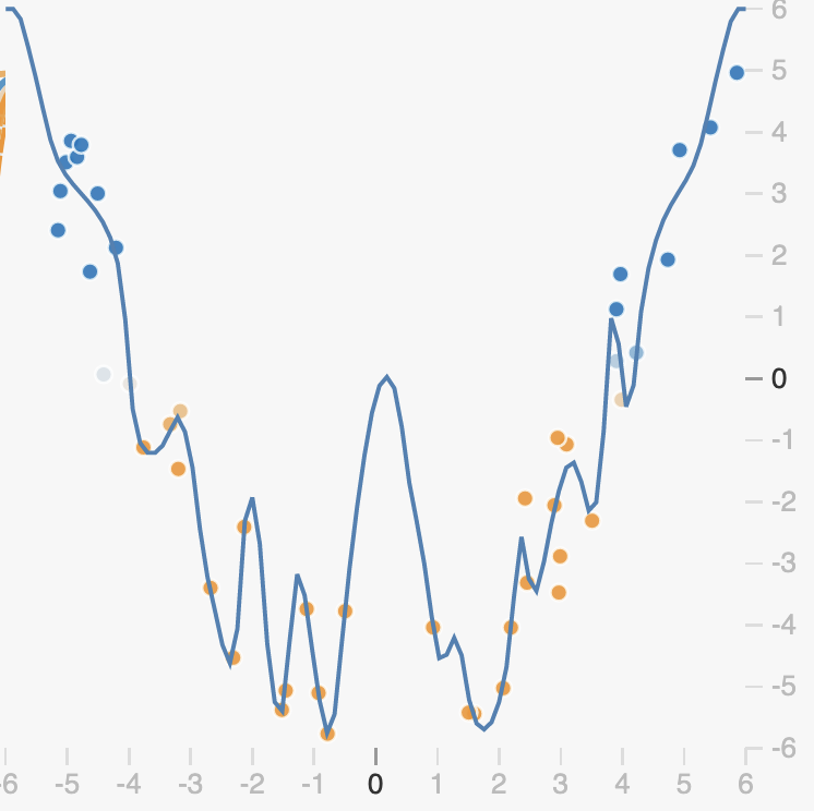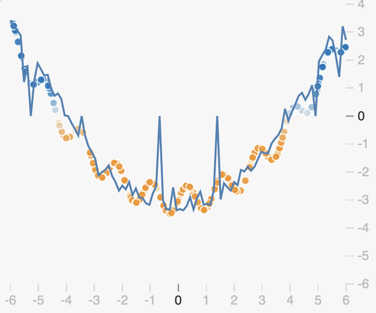 When we’re evaluating our model or trying to make predictions on new data, we likely don’t want our prediction function to be noisy. As we can see in the examples above, applying dropout can lead to poor predictions if we’re unlucky. A simple approach might just remove the dropout functions at evaluation time: