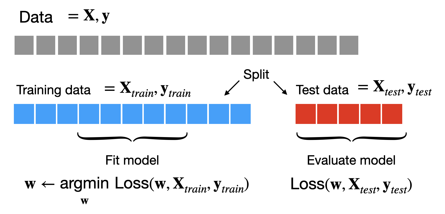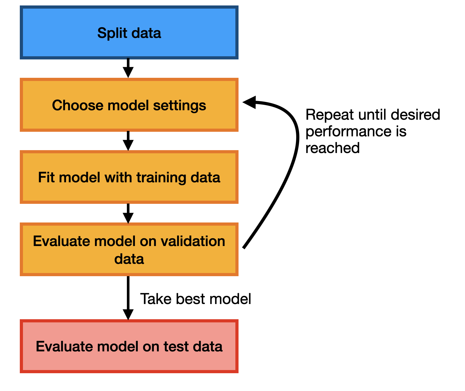 If our test loss isn’t very good we may decide that we want to change our hyperparameters and train the model again. We could keep doing this over and over until we get a test loss that we’re satisfied with. However, as soon as we use the test data to make choices about our model, the test loss we’ll no longer be an unbiased estimate of the performance of our model on new data! After all, we’ve now used it to fit our model. This isn’t ideal as we will no longer have a reliable estimate for the true performance of our model.