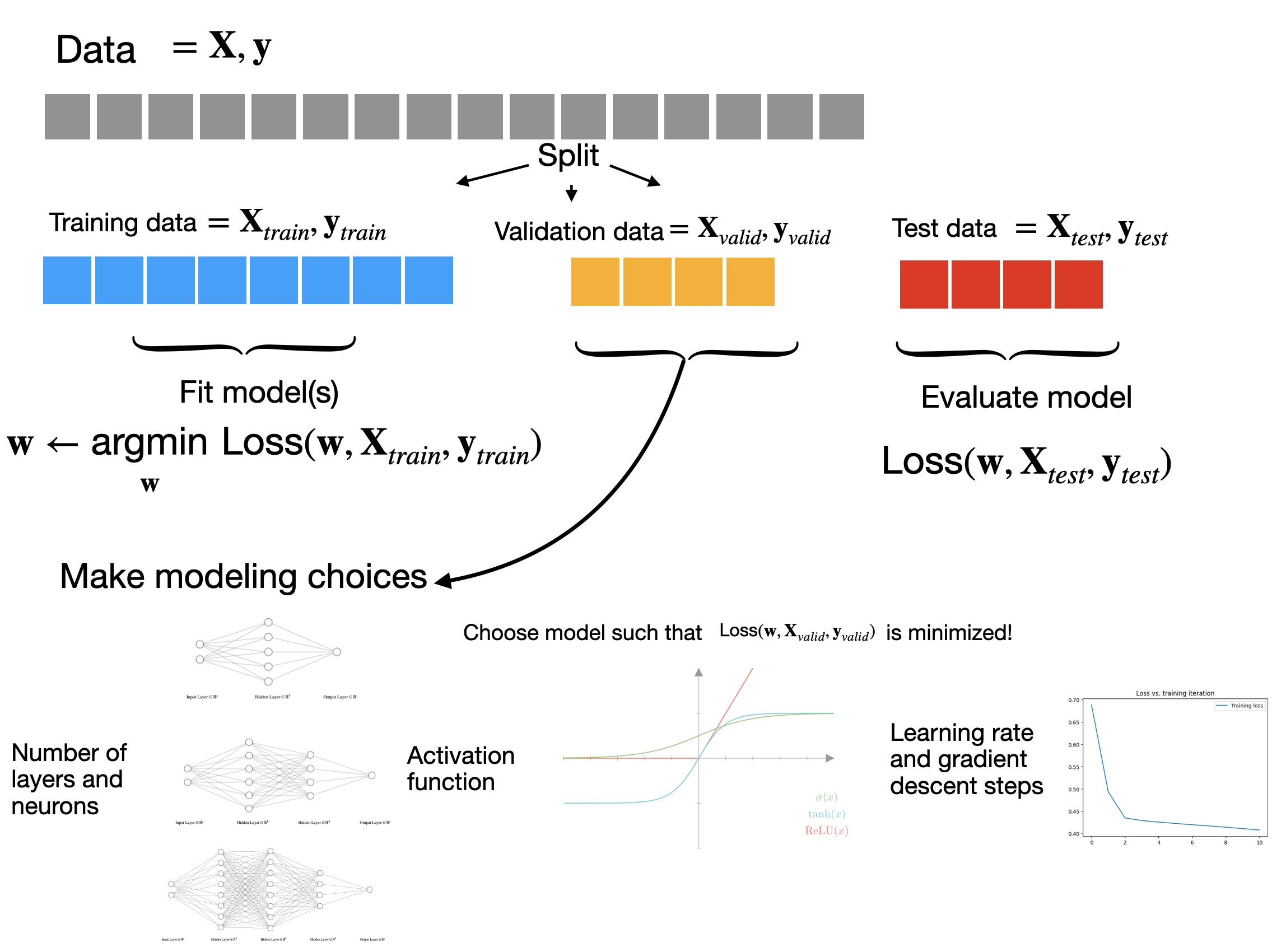 A simple approach to addressing this is to split our data into 3 parts: a training set that we’ll use for gradient descent, a test set that we’ll use for evaluating our model, and a validation set that we’ll use for choosing hyperparameters. When we run gradient descent, we can hold out both the test and validation sets, but we’ll allow ourselves to use the performance on the validation set (the validation loss) to choose hyperparameters. The test set we’ll reserve for the very end, when we’ve definitively chosen our model and need to estimate how well it will do. At a high-level the process looks like this:
