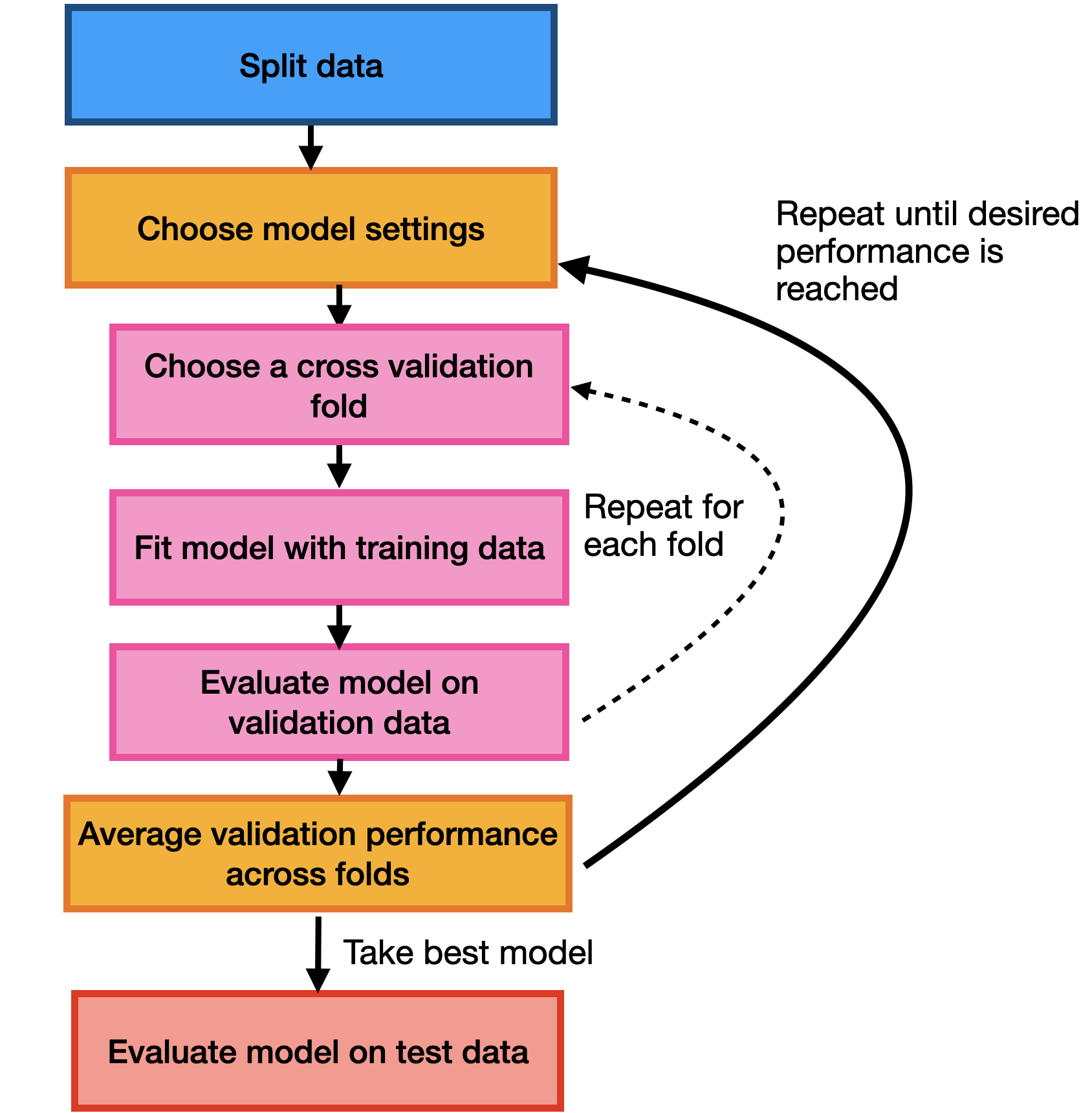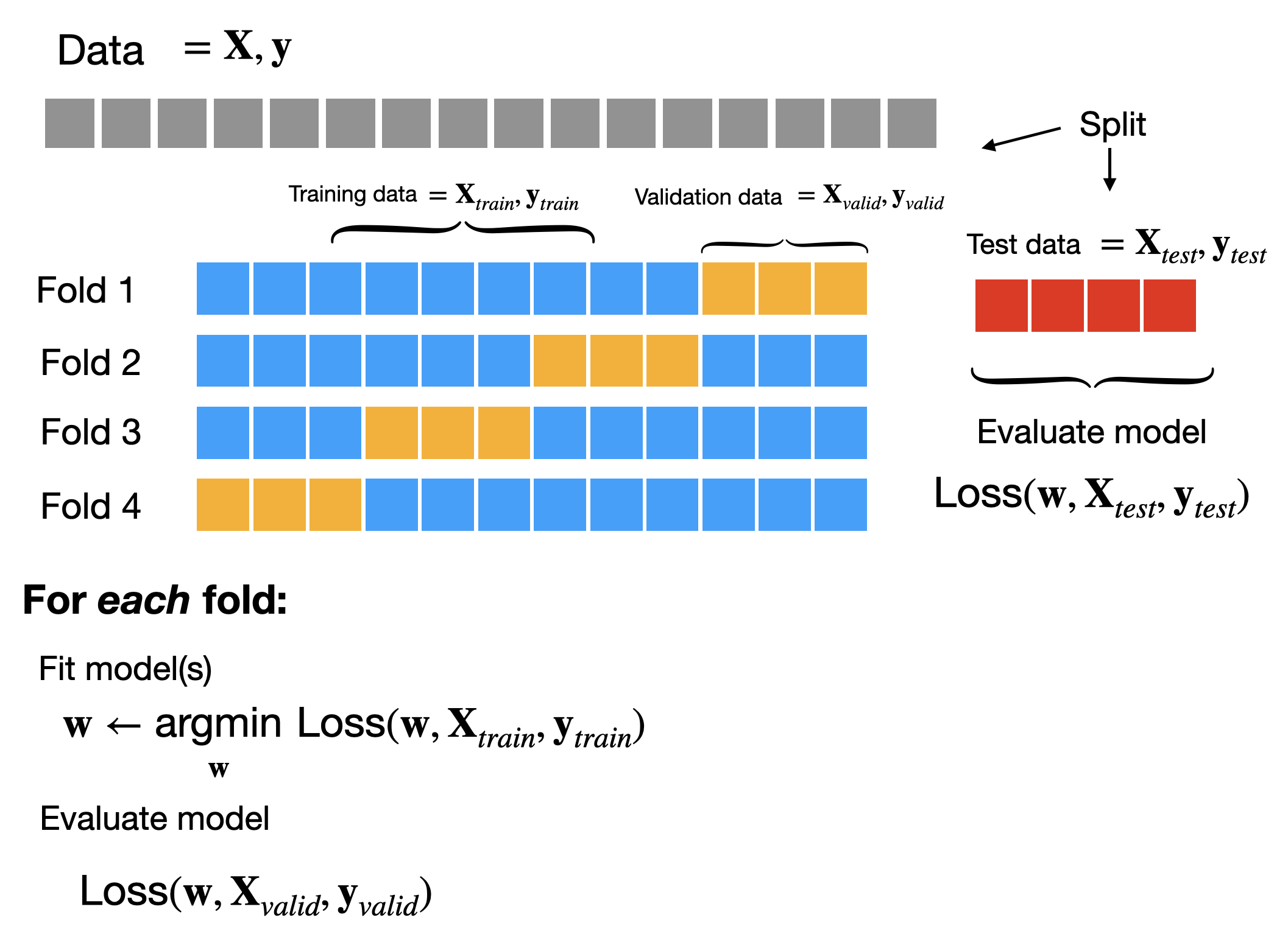 To evaluate the performance of a given hyperparameter setting we can train our model multiple times, each time holding out a different group as the validation set. This gives us \(K\) estimates of the performance of a given choice of hyperparameters.