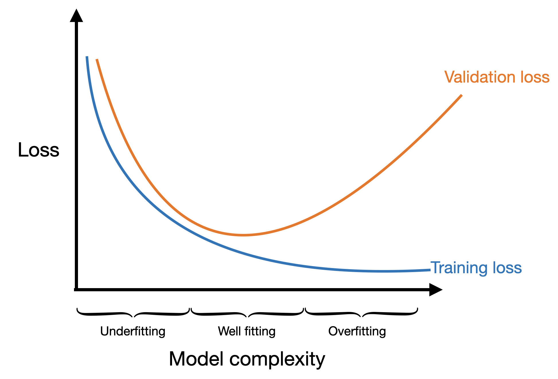 If we think about plotting our training and validation loss as a function of the complexity of our model, we might see underfitting when the model is very simple and overfitting when the model is very complex. The idea model would be right in the middle when the validation loss is at its minimum.