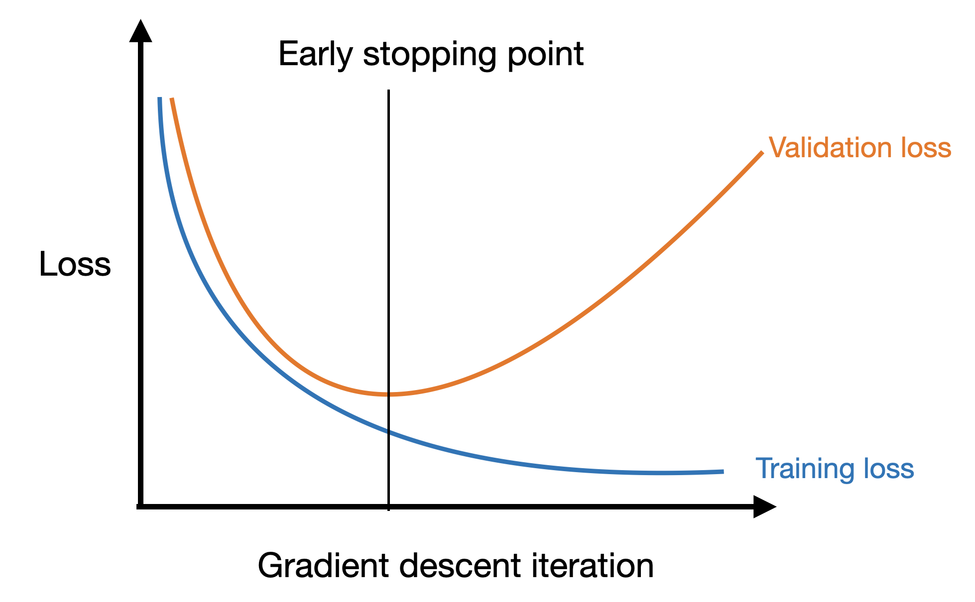 The plot above suggests a simple strategy for preventing overfitting: simply stop gradient descent when the validation loss begins to increase! We call this approach early stopping.