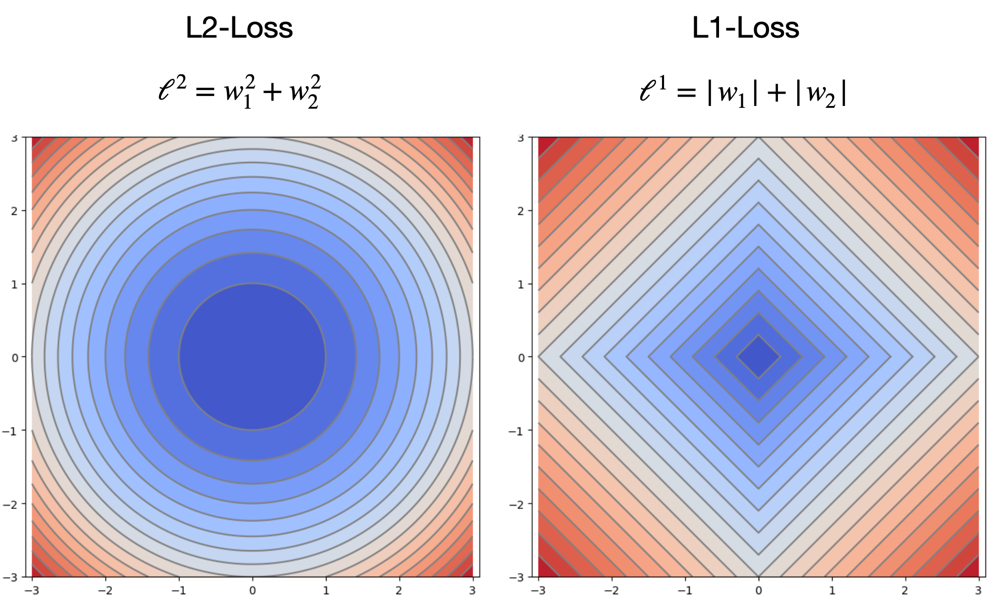 We can see the same distinction if we plot the L2 and L2 losses as a function of 2 weights: